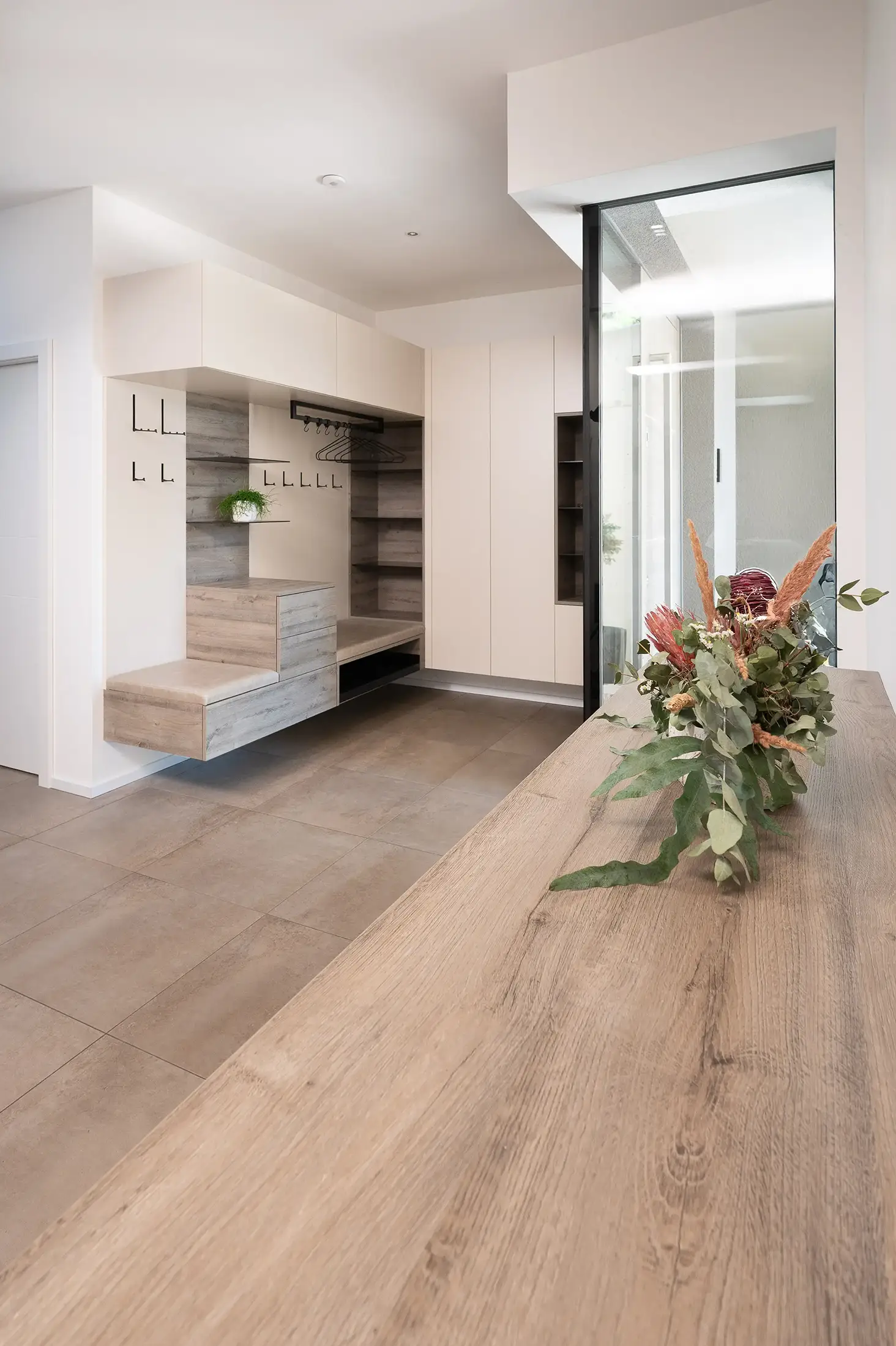 Der Eingangsbereich ist mehr als nur ein Durchgang – er ist die Visitenkarte Ihres Zuhauses. Mit einem durchdachten Design schaffen wir Garderoben und Vorzimmer, die Funktionalität und ästhetisches Ambiente vereinen.